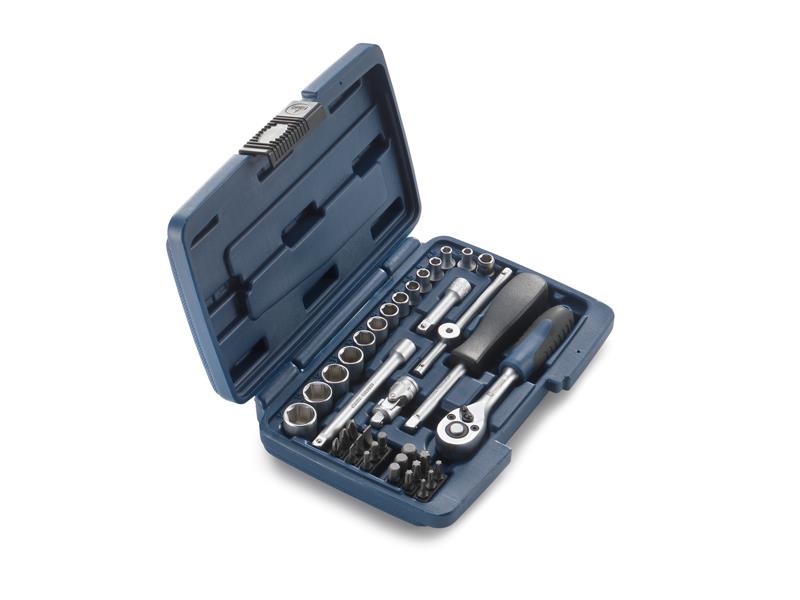 38-piece, 1/4′ toolkit in blue with high-quality, chrome-vanadium tools. Ratchet (with locking device), socket lever, two extensions and socket wrench. External hexagon from 4 to 14, hexagon socket from 3 to 8, Phillips, slotted and Torx bits. This kit allows you to complete small jobs on your Husqvarna quickly and reliably. Whether you’re removing trim parts or changing the oil, you’ll definitely find the right tool here.